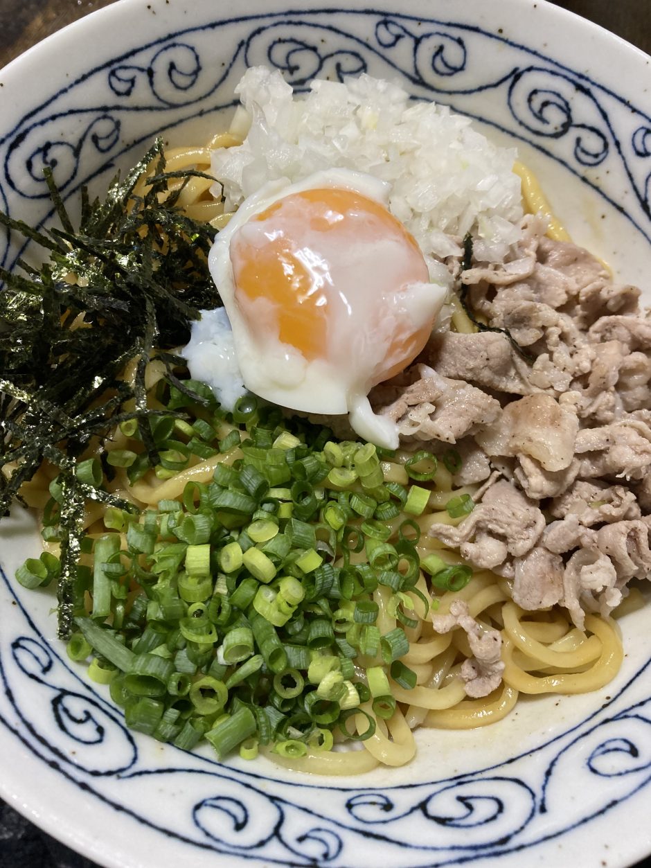 7、1で混ぜ合わせたタレを大匙3ほどかけ麺に絡ませ、お好みのトッピングを乗せたら完成。